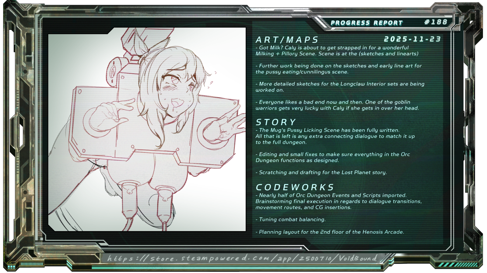 A fresh Bad End is underway. One of the goblin warriors gets an… unexpectedly lucky moment with Caly if she pushes too far. Sketches are underway to capture the tone and staging of this outcome.